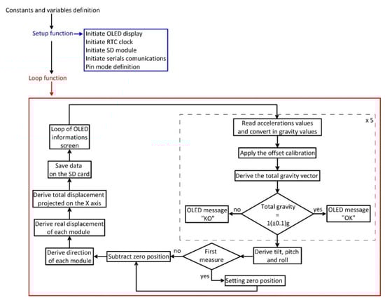 The logic of the code (reported in the Supplementary Materials) developed for operating the master station is reported in Figure 9. After first initialization of the variables and the libraries to activate the interfaced boards (i.e., OLED display, SD card adapter, RTC clock, and communication device), the loop begins. The master station first requests data from the modules through a specific request on the communication bus. Each request provides readings from a single measuring unit characterized by a specific addressed. Received raw acceleration data, already compensated for thermal drifting and filtered for dynamic acceleration components, are converted in gravity values, and the offset is removed. At this point, the code is designed to check for the correctness of the gravity data through Equation (4). In case of an error, the corresponding led on the master station turns red, and the error is indicated to the user on the OLED display.