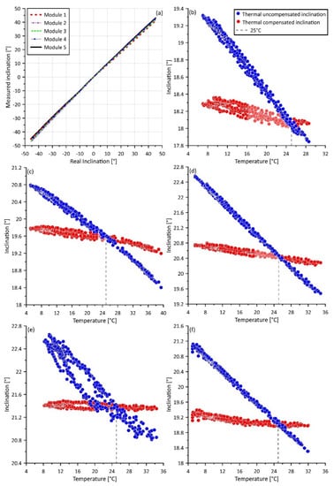 Figure 11b–f reports results from the uncontrolled thermal efficiency test. Specifically, the graphs show both the thermally compensated and uncompensated inclination data, measured by each measuring unit (red and blue dots, respectively). Since sensors are calibrated by the manufacturer to work at 25 °C, the compensated and uncompensated datasets have the same tilt value at this temperature. The observation of this effect can be considered an indication of the correctness of the measurements. Both datasets were used to derive an estimation of the RMSE error in comparison with the real values measured at 25 °C and its reduction after sensor optimization through the application of the thermal compensation. The RMSE and its variation is presented in Table 2. The reduction of the RMSE due to sensor optimization in a thermal drifting perspective is consistently high, varying between 74 and 86%. In addition, Figure 11b–f provides an overview of how the application of a thermal compensation strategy in sensor optimization can reduce the thermal drifting of low-cost MEMS accelerometric sensors, making them suitable for operational monitoring in natural field conditions.