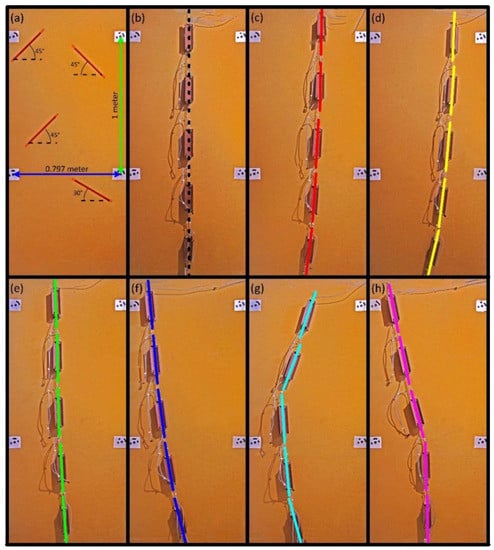 Configurations and results of measurement tests of the multi-module inclinometer. The multicolor segments represent inclination registered by each module in each simulation. (a) Linear markers used for the validation of the method of analysis; (b–h) synthetic curve derived by the analysis of orthoimages in GIS environment representing the shape in operative conditions of the multi-module system; The geometric configuration of (b) is the reference for measuring displacement simulated by synthetic configurations (c–h).