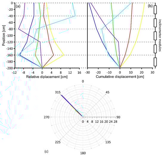 Graphs showing results from inclinometer measurements reproduced in the test. (a) Results in terms of relative displacement; (b) results in terms of cumulative displacement; polar graph (c) depicts the direction of cumulative displacement from the base to the head of the column.