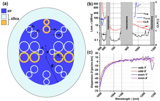 (a) Cross section of the DHC-ARF; the descriptions and values of the dimensions can be found in the main text. The cross-section is rotated by 90° when compared to the one presented in Figure 3. (b) The highest losses of the fundamental modes (αFM, black curve), the lowest losses of the higher order modes (αHOM, blue curve) and the coupling length ratio (CLR, red curve) with respect to the wavelength. The arrows indicate the Y-axis corresponding to the pointed curve. (c) Dispersion D versus wavelength of the four fundamental core modes with different orthogonal polarizations (-Y or –X) and parity (even or odd) in the 3rd antiresonant window of the proposed DHC-ARF. For λex = 1064 nm one can see that D ϵ < 0, 5 > ps/nm × km, making it a negligible value for the multiphoton fluorescence-based diagnostic setups.