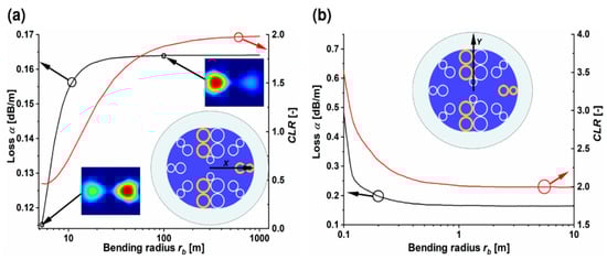 Bending properties of the DHC-ARF. Loss and CLR coefficient for different bending radii along (a) the X-axis and (b) Y-axis. The insets present the cross section of the DHC-ARF together with the black arrows indicating the orientation of the bending direction (marked as X or Y in the cross-section of the structure). Additionally, in (a) two mode profiles at rb = 5 m and 100 m are presented, showing the energy transfer between the cores as the bending increases. The red and black arrows, connected with the circles of the same color, indicate the Y-axis corresponding to the circled curve.