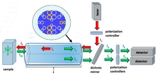 Fluorescence anisotropy measurement setup based on a DHC-ARF with length L. The excitation beam (laser) is coupled into one of the cores (excitation core) of the DHC-ARF. After the sample is excited, its fluorescence signal is collected via the same core. During the back-propagation of fluorescence, its two orthogonal polarization states are separated (one in each core of the DHC-ARF). Finally, their intensities are measured using two detectors. The presence of polarization controllers in front of the detectors allows the user to eliminate any signal with an unwanted state of polarization.