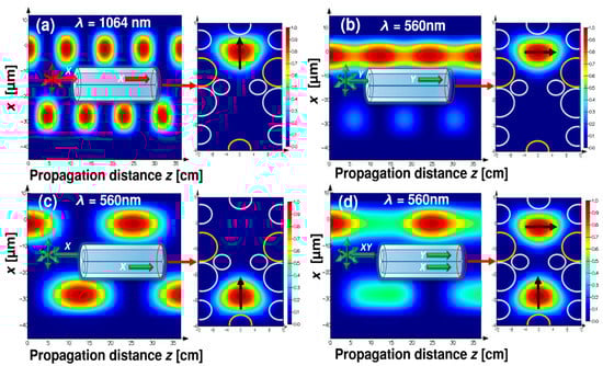 Distribution of the electric fields intensities during propagation along the DHC-ARF and at the output end of the DHC-ARF, for signals with different wavelengths and polarizations. Propagation of the (a) X-polarized excitation signal at 1064 nm, (b) Y-polarized fluorescence signal at 560 nm, (c) X-polarized fluorescence signal at 560 nm and (d) unpolarized fluorescence signal at 560 nm. Insets in (a–d) visualize the direction of propagation in the cores of DHCARF for a given situation; letters X- and Y- are related to the polarization direction. Red circles indicate the distal end of the DHC-ARF, where the output mode fields were calculated. Those fields are presented on the right of their corresponding propagation graphs, pointed out by the red arrows. The yellow and grey circles in the output mode field figures are the DHC-ARF’s capillaries, with different colors indicating capillaries with different thicknesses, as previously described in Figure 2a. Black arrows indicate the polarization direction of the output signal.