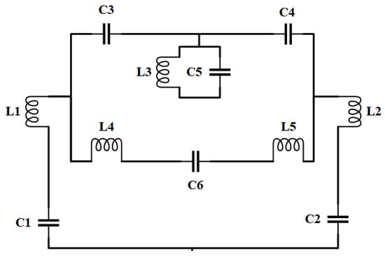 where w = width of microstrip patch, h = height of substrate, and υ0 = velocity of light in free space. They are subject to fringing effects, which means the patch of the microstrip antenna looks electrically greater than its physical dimensions. It is noteworthy to mention that an increase of the substrate height expedites fringing and leads to larger separations between the feedline and resonance frequency. However, inductors (L1 to L6) and capacitors (C1 to C6) individually signify each microstrip on the proposed antenna. Leq and Ceq are calculated using Equations (3) and (4) using the lumped components’ characteristics [36,37].