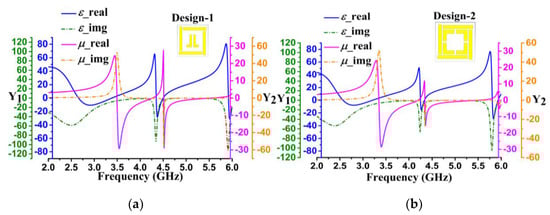 Metamaterial DNG unit cell embedded in the proposed retro VMA is a design based on the finite integration technique (FIT) and detailed design procedure reported in the article [38]. This split pitch square (SPS) design forms a perfect resonance circuit using the microstrip patch; thus, the EM signal is stuck between two vertically balanced sections. Moreover, impedance and admittance have been calculated through proper stimulation to obtain negative index metamaterial properties, widely termed as DNG. Figure 3 illustrates the overall design evolution with dielectric parameters (ε, µ) for DNG characteristics’ existence in the operational bandwidth numerically. The initial unit cell design, design-1 (Figure 3a), started with the SPS patch near the structure edge and the mirror-reflexed L shape at the center with a gap of 0.5 mm. The negative index of ε = 3.4 starts at approximately 4.32 GHz and continues up to −26.5, though µ starts to show a positive index of 1.64. Unfortunately, at 4.27 GHz, µ is only −0.62, which implies that design-1 has a DNG feature but is not so significant in the entire operational bandwidth. Followed by design-2 and design-3 in Figure 3b,c, both parameters try to dominate each other, specially design-3. Design-2 includes an additional square patch without center patching, whereas design-3 comprises the L shape patch. Thus, the mutual resonance expedites but shifts the permittivity (−8.15, at 4.4 GHz) and permeability (−0.81, at 4.29 GHz) at the edge of the bandwidth in design-3. Besides both designs, the performance variation indicates combining and optimizing the patch gaps and widths would enhance the possibility of obtaining a more negative index simultaneously. Finally, in Figure 3d, optimizing the square patch width horizontally obtains the metamaterial DNG unit cell’s geometry. Notably, the waveguide port configuration achieves ε = −16.2 and µ = −0.55 at 4.30 GHz. Therefore, the floquet port excitation technique was further investigated numerically to verify the DNG characteristics.