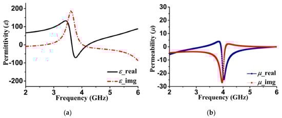 The waveguide port configuration reveals the X band performance of SPS [38], but to validate the negative permittivity (ε) and permeability (µ) feature for the proposed antenna, CST’s default Floquet theorem was adopted. The theorem considers the SPS as a periodic structure, and periodic boundary conditions for theta (θ), and phi (φ) accordingly. The Eigenmode solver was applied particularly for TE10 mode and the corresponding dielectric properties (ε, µ) are plotted in Figure 4. The simulated data illustrate that the real value of ε is approximately −1.1, and the real µ is −9.4 at 4.27 GHz. Following the bandwidth (up to 4.4 GHz), the permeability remains negative (−4.94), but unfortunately, the permittivity becomes positive. Thus, DNG characteristics exist between 4.27 and 4.4 GHz and indicate a potentiality to enhance the performance based on the literature study. However, the number of the unit cell for the front and ground plane identified through the extensive parametric study will be described in the following sections.