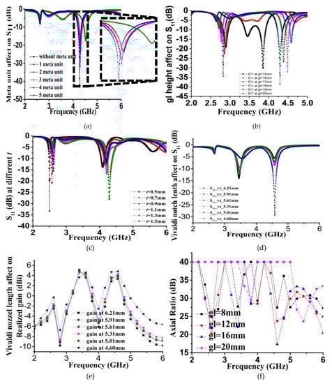 The proposed retro VMA with an extended V arm and metamaterial loading reveals a significant key performance modifier. Besides other geometrical parameters like the substrate thickness (t), the V arm notch has a considerable impact on the major antenna parameter, as shown in Figure 5a–f. For instance, Figure 5a illustrates the metamaterial DNG unit cell loading effect on both sides of the proposed antenna. The inset of the figure clearly shows that without any meta unit, the loading reflection (S11) was not significant between 4.25 and 4.4 GHz. Still, there was a gradual increase in the number of unit cells enhancing the S-parameter from −22 dB to −43 dB in the simulation. The absence of the meta unit or one unit cell does not demonstrate any improvement of S11, whereas the arrangement of five units is much better than the rest. As mentioned earlier, the DNG unit cell-balanced structure reinforces the EM field along with the proposed antenna structure. However, a mutual coupling of the surface current reduces and slightly shifts the refection parameter for four unit cells. Hence, incorporating patch geometry is a great effort to improve the performance. Then again, the ground plane with two adjacent splits illustrates a shifting of the resonance frequency as well as broadening the bandwidth. For example, gl = 15 mm shows multiple resonance frequencies between 2.75 and 4 GHz, but gradually, major resonance shifts above 4 GHz as the height increases (Figure 5b). The substrate thickness and notch length variation follow the same trend of resonance shifting. The lower notch length enhances the gain rather than the higher dimension in the expected 4–5 GHz frequency spectrum, as shown in Figure 5c, because the electric field becomes more dominating at the shorter notch. However, an interesting change was observed for the substrate thickness during the simulation. At the 0.5-mm thickness, the proposed retro VMA gives S11 exactly at 2.5 GHz with −33 dB as a potential ISM band operation. As t increases, a smooth tuning of the reflection parameter is demonstrated and operated between 4 and 4.5 GHz. In Figure 5e, the realized gain (dBi) is shown with the slotted notch length changes, with insignificant variation. At the lower and upper band, negative gain is observed, and hence, the notch length was selected to be 4.60 mm since it has an average value of 4 dBi. The axial ratio (AR) bandwidth performance (Figure 5f) to ground plane height shows a range of variation between 17 and 40 dB. Thus, the polarization of the E-field, especially the circularly polarized field, is made up of two orthogonal E-field components of equal amplitude that do not comply with the standard. Further study of the antenna will improve this factor.