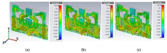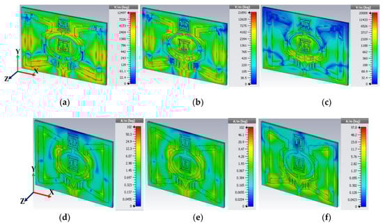where m and n are the mode of EM wave propagation through the proposed antenna. Other important changes along the length and width are microstrip patch variation, which intensifies the extended arm tank circuits in the two sides’ resonance to exhibit a significant E-field and H-field concentration. The harmonic resonance of the LC tank circuit becomes distorted as the frequency increases and is deformed by field polarization. Remarkably, a minor difference in the magnetic field concentration is noted in Figure 6d–f. From Maxwell’s equation, the intensity of the electric field E and magnetic flux density B are related using the curl of the electric field [41]. Similarly, the magnetic field intensity H and electric flux density D use the same calculation with an extra parameter current density J. Therefore, the standard ‘Helmholtz equation’ solution comes as a wave vector potential as: