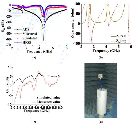 where Z(x) is the characteristic impedance, Zi is the input impedance, and β is the phase constant. So, Figure 8b represents changes of Z(x) by plotting the real and imaginary values. Though the 49.93 Ω real value is the initial value at 4.27 GHz, unexpectedly, it decreases to 30 Ω gradually at 4.4 GHz. In Figure 8d, the simulated and measured gain (dBi) are illustrated as a performance comparison. Even though the negative gain is shown occasionally at some lower and higher frequencies, the expected operational bandwidth was achieved up to 7.14 dBi. The negative portion simply means the S11 response became insignificant due to ohmic and dielectric loss of the substrate or coupling of the unit cell antenna and SMA port, external radiation from the feeds and junctions, and excitation of the surface wave.
