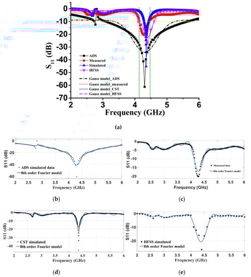 On the other hand, the FS model converges at the eighth order with the best-fitted data for the four different reflection coefficient (S11) data set. Figure 9b–e clearly shows all approximated S11 data using the following general model FS function: