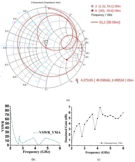 Since the proposed antenna followed the transmission line principle to be designed and developed, the smith chart would be an appropriate tool to analyze the impedance (Z). Figure 10a illustrates Z from 2–6 GHz but particularly focusing on the expected bandwidth operation, which is 4.27–4.4 GHz from the SC (short circuit) to OC (open circuit) terminal. Starting from the high impedance end (at 2 GHz) with two full-wave rotations along the transmission line results in 49.93 Ω at 4.27 GHz. As the maximum measured reflection coefficient point at 4.30 GHz, as shown in Figure 8a, the impedance shifts to 55.05 − j1.8 and continues to reach 33.72 + j16.08 at 4.40 GHz. VSWR (voltage standing wave ratio) of the proposed antenna is approximately the following (Figure 10b) standard value over the operation band. Earlier, the few reported antennas [47,48] recommended, for potential applications of the most slotted shape, values less than 2. The proposed VMA shows a VSWR of 1.01 at 4.27 GHz and was maintained close to that up to 4.34 GHz. After that, it increased to 3 at 4.40 GHz and matching between the transmission line decreased. This compatible VSWR gives a high directivity of more or less 7 dBi. Besides, the simulated gain (dB) also aligns with the claim, as shown in Figure 10c, where the operational bandwidth has a range of 6.93–5.65 dB.