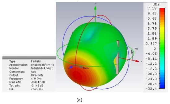 Figure 11a,b shows the simulated 3-D far-field radiation pattern of the proposed antenna, where the radiation efficiency is about 90% at 4.34 and 4.27 GHz. However, the total efficiency is reduced by 46% and 38%. Furthermore, the simulated and measured radiation efficiency are plotted in Figure 11c. The experimental efficiency dropped down to 80% compared to the simulated one. However, beyond and above the stated bandwidth, this difference is much more. A lack of proper finishing during etching leads to the copper layer being missed (less than 0.1 mm in size) in two vertical extended arm edges. Therefore, it may affect the radiation efficiency. A measured radiation pattern at 4.30 GHz is illustrated in Figure 11d, which was measured in Satimo Starlab, UKM. The radiation characteristics of the E-plane (Figure 11e) and H-plane (Figure 11f) were compared through a simulation and measured environment at 4.30 GHz. The co-polarization and cross-polarization have some deviation due to an unequal phase distribution, but referring to the specific directional operation, it has strong field pattern compliance. However, a general discussion of the out-of-band rejection of the prototype introduces two issues. First, the proposed antenna structure and microstrip patch followed the narrow adjacent line rather than the wider arm formation. Furthermore, the antenna must maintain the minimal dimension for a low profile, so the effect of reducing the substrate thickness reveals the tunability property. Secondly, the electric field at 4.27 GHz indicates an extended V arm has a more concentrated distribution in several horizontal, vertical, and tapered patches but increasing the resonance frequency loses this field. Besides, it concentrates the field closer to the feeding point precisely on the lower part of the parabolic horns. Hence, the out-of-band peaks are a combination of the two effects above, and both can be tuned by the substrate permittivity value. This tuning is limited by two reasons: (1) On the one hand, the change of permittivity modifies the width of the antenna; and (2) the values of dielectric permittivity are conditioned to the available commercial substrates. A comparison of the features is tabulated in Table 2 in terms of the design gain and development technique, physical geometry, etc. for understanding the contribution of the proposed retro VMA. Certainly, the low-profile antenna with a thin microstrip patch is unable to meet a few novel characteristics. For example, an incompatible dimension due to the application perspective, conformality, radiation efficiency with specific gain, and polarization insensitivity. A few relevant papers have a relatively low and high dimension with competitive parameters. Still, they are underwhelming in terms of the dimension constraint, efficiency, or adopted technique limitations for the prospective application field. For example, the transmission line model [49] or filtering [14] technique has a lower dimension compared to the proposed antenna. Still, those prototypes have limitations like a reduced realized gain or are bulky in size. Similarly, the characteristic model [50] and the split ring method [51] either suffers from impedance accuracy of the overall structure or a lack of experimental validation of the projected data. Besides, a robust design approach, such as stacking [52] or frequency selective surface (FSS) [53], has a significant realized gain, though the efficiency was not reported in the corresponding article.
