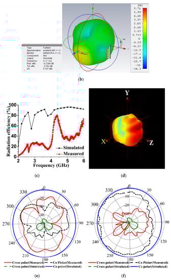 Radiation characteristics of the proposed antenna far-field radiation pattern (a) at 4.34 GHz; (b) 4.27 GHz; (c) Simulated vs. measured radiation efficiency; (d) Measured radiation at 4.30 GHz; (e) E-plane radiation; (f) H-plane radiation at 4.30 GHz.
