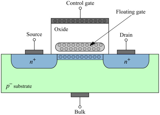 Floating-gate MOS transistors are at the core of every modern nonvolatile memories [17]. A floating-gate MOS structure consists of two gates: floating and control gate, as shown in Figure 1. A floating gate is surrounded by silicon dioxide to be isolated from the rest of the MOS structure, and it is usually made of polysilicon. The control gate is a gate on ordinary MOS transistor. To charge the floating gate, a positive bias should be applied on the control gate to drag the electrons from the channel to the floating gate (FG). Of course, the channel needs to be formed first by putting a potential between the source and the drain.