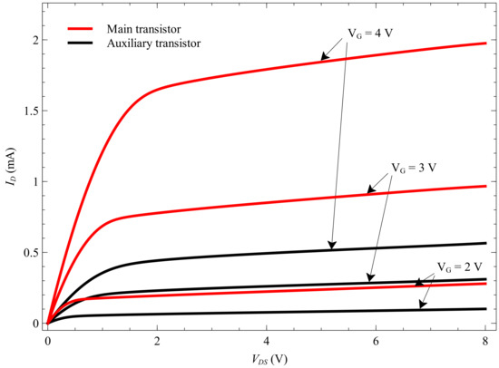 We can distinguish between the main and auxiliary transistor. The programming pin is the drain terminal, whereas the V-pin is the source for the auxiliary transistor. To confirm that assumption, we measured the output characteristics of the main and auxiliary transistor (Figure 6). The control gate (grey layer) and a floating gate (red layer) are common for both transistors. We assumed that there is a big area of floating and control gate layers between the auxiliary and main transistor. That area is the storage for electrons so the EPAD can achieve great stability [22]. The purpose of the auxiliary transistor is to charge the floating gate by injecting hot carriers near the drain or by tunneling [25]. A very similar structure is represented by Tarr et al. [29]. Their design has no auxiliary transistor, only an injector gate with the same purpose.