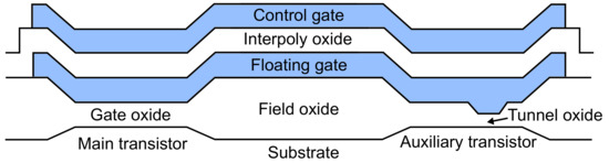 Based on everything previously explained, we drew the cross-section of the EPAD structure (Figure 7). Floating gate and control gate are extending along the entire cross-section. Interpoly oxide is isolating the two gates; it is usually made of oxide-nitride-oxide (ONO) layer. Field oxide is very thick silicon-dioxide layer; its purpose is to minimize the effects of the electric field from the floating gate on the substrate and to isolate the large area of the floating gate. Although field oxide is essential for using this structure as a floating-gate dosimeter because we need large volume for the radiation-generated charge (electron-hole pairs), and field oxide is perfect for that purpose [30]. Tunnel oxide is very thin silicon-dioxide layer, it is used for charging the floating gate, and it degrades with charging cycles. As mentioned above, the auxiliary transistor is designed for charging the floating gate. Therefore, degradation of oxide structure because of FG charging that is inevitable is not affecting the main transistor. During irradiation, all oxides in the structure have electron-hole pairs generated. Amount of radiation-generated charge depends on the electric field in the oxide and the oxide thickness [31]. Therefore, field oxide will produce the most electron-hole pairs, but it will also be the most degraded oxide, which is good because degradation from the field oxide and tunnel oxide will not affect the main transistor. Here, we can conclude that this structure can provide stability for the dosimeter application. Considering that EPAD is fabricated in CMOS technology, a future dosimeter based on this structure can be monolithic.