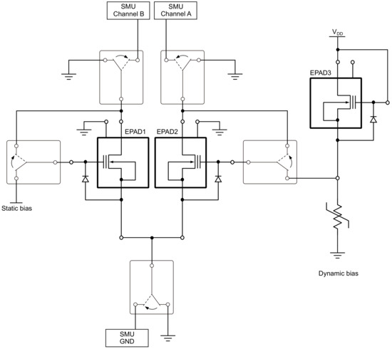 As can be seen in Figure 9, there are two configurations. One, when the relays are in the neutral position, to bias the transistors during irradiation steps, and the other, when all relays are active, to measure the I-V characteristics of EPADs. Neutral position of the dynamic bias corresponds the electrical schematic shown in Figure 8. EPAD1 and EPAD2 are intended for measurement, while EPAD3 provides dynamic biasing for EPAD2. It should be emphasized that the ground of the biasing part and dual-channel SMU is separated to minimize the noise during the measurement. Since all relays need to be switched on simultaneously in one block, it is possible to design a system with double relays (two relays, one coil), which reduces the number of pins for relay control. It may be noted that the programming pin and V-pin are grounded since the auxiliary transistors were not part of the study of this experiment.