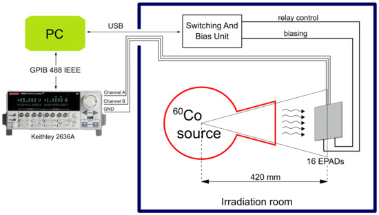 The experimental setup consists of 16 EPADs (8 ALD1108E integrated circuits) whose transfer characteristics are measured cyclically throughout the experiment (irradiation steps). The experiment consisted of two phases, irradiation and spontaneous recovery. Irradiation was performed to a total absorbed dose of 750 Gy, at a dose rate of 32.645 Gy/h in water, and spontaneous recovery took place at 27 and lasted for a total of 46 days (1107.7 h). The setting of the experiment during irradiation is presented in Figure 10.