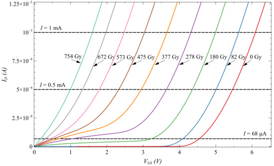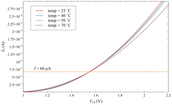 The EPAD threshold voltage is defined, by the manufacturer, as the value of the voltage at current [22]. Zero temperature coefficient (ZTC) point is defined for current value of . As the value of ZTC current is a very important parameter for the EPAD operation as a radiation sensor, the manufacturer’s claim was experimentally confirmed, and the graph is shown in the Figure 11. We can observe the overlap at a current value of of the transfer characteristics of EPAD measured at different temperatures. The threshold voltage of the measured EPAD was . Using reader-circuit configuration in ZTC point can provide temperature independence of the radiation sensor. Thus, ZTC point is a significant parameter.