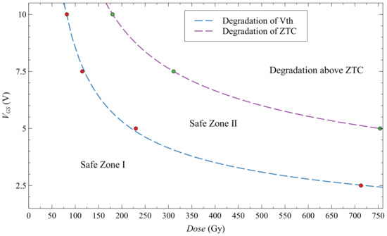 Because of this problem with degradation, we decided to make a Safe Operating Area of EPAD based on all information from the group of EPADs with static bias (Figure 13). Safe Zone 1 is the area where the threshold voltage can be monitored, and Safe Zone 2 is the area where ZTC voltage can be monitored. Above curve that is representing the degradation of ZTC, it can be traced only higher than ZTC values. EPADs with zero bias are not degraded, and curves that are describing the degradation of Vth and ZTC are only converging to zero. Degradation of transfer characteristic of EPADs can be explained as a parallel resistive path that was opened in the floating-gate MOS structure [27]. In our earlier work, we showed that after annealing at 70 transfer characteristics had recovered.