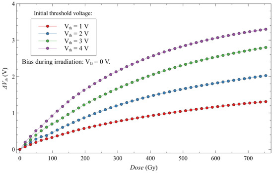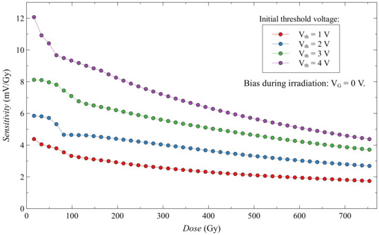 Threshold voltage shift for a subgroup of EPADs with zero bias is shown in Figure 14. We can observe a threshold voltage shift depending on the absorbed dose for four different values of the initial threshold voltage. The most significant voltage shift with the absorbed dose has EPAD with the highest initial threshold voltage. Thus, the sensitivity increases with the initial threshold voltage, i.e., with the amount of charge on the floating gate. We note that the dependence of the threshold voltage shift with the dose is not linear, but it decreases, and thus the sensitivity decreases during irradiation. It can be better seen in Figure 15, where is shown the sensitivity of these EPADs with absorbed dose. The sensitivity was calculated as the change in threshold voltage divided by the value of the absorbed dose. As the floating gate is discharging during irradiation, its electric field weakens and, consequently, a smaller generation of electron-hole pairs occurs, resulting in less discharging of the floating gate. For this reason, the sensitivity of EPADs with only an internal electric field (from the FG) decreases with the absorbed dose.