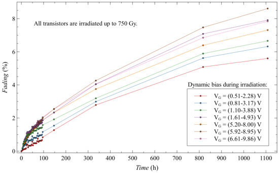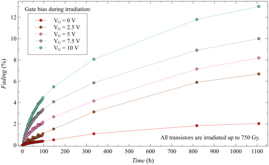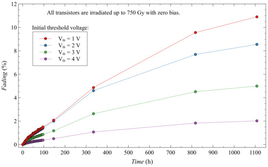 where is the threshold voltage immediately after irradiation, is the threshold voltage after spontaneous recovery, and is the pre-irradiation threshold voltage. Figure 16 shows fading for the first 1100 h after irradiation. We notice that as the initial threshold voltage of the EPAD increases, the fading decreases. We assume that when the electric field from the floating gate is weaker, the holes are more trapped somewhere in the oxide and, after irradiation, create instability.
