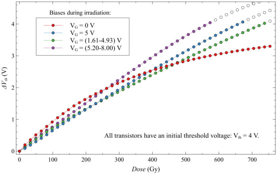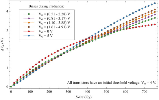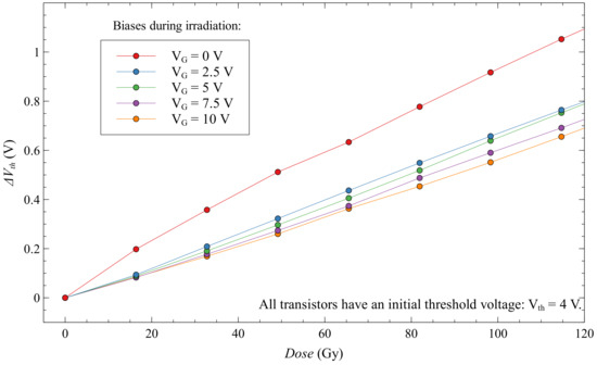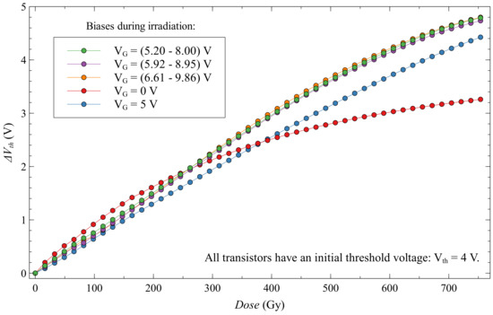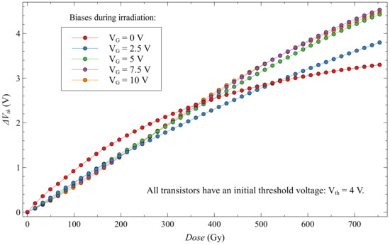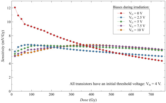 EPAD with zero bias and 4 V initial threshold voltage has definitely the highest sensitivity in the range of 300 Gy, and the lowest fading. However, the dependence of absorbed dose is not linear. Maybe, if we use this biasing configuration in recharging mode, such as presented by the group of authors [36,37,38], the dependence of the absorbed dose can be linear and even with higher sensitivity. In that case, the radiation sensor should have some extended electronics that will continuously measure and do recharging.