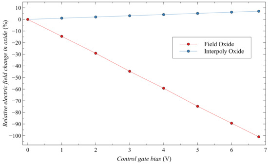When we increase the voltage at the control gate, there is a decrease in energy in the floating-gate structure, the electric field in the interpoly oxide and the field oxide changes. Because the field oxide is significantly thicker than the interpoly oxide, changes in the electric field are more drastic. So, we made a graph (Figure 25), where we can see the relative change in the electric field with the change in voltage at the control gate. The electric field strength in field oxide decreases by more than 100% and in interpoly oxide increases by only 7% for 6.8 V bias at the control gate. We can consider that the field change in the interpoly oxide is almost negligible compared to the change in the field oxide. This may explain why biasing the control gate we have a decrease in the sensitivity of EPADs. As the floating-gate decrease, the influence of the control gate bias becomes more dominant.