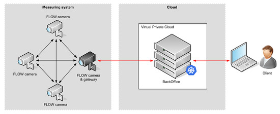 All cameras in the measurement system form a self-organized ad-hoc network. We use both CSMA (Carrier Sense Multiple Access) and TDMA (Time Division Multiple Access) techniques to minimize the effects of packet collisions and the need of packet retransmissions. A protocol has been designed to allow nodes (cameras) to join the network and allocate timeslots for all the devices to maximize the bandwidth usage. It allows forming ad-hoc network with only two nodes or whenever more nodes join the network. In the network one of the nodes becomes responsible for sending beacons which synchronize the network operation, but other ways of synchronization are possible. For example, the nodes can use lightweight time synchronization protocols (such as References [27,28]), or external synchronization signals (e.g., from GPS receivers) if in-network synchronization is troublesome or inefficient due to the size of the network.