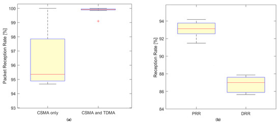 Packet reception rate (PRR) during normal operation (a) and PRR/DRR values under heavy traffic (b).