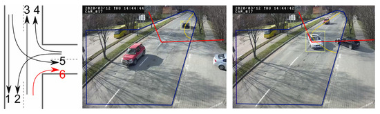 Possible trajectories of vehicles (trajectory 6 is not tracked) and examples of tracking for trajectories 4 and 5. Blue line marks the region of interest—objects outside are excluded from tracking. Red line is a line of detection—vehicles crossing this line are automatically assigned to trajectory 1 or 3, depending on the direction they move. For clarity, each of the vehicle tracked is presented on a separate snapshot.