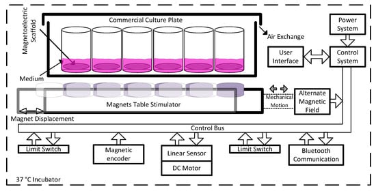 A bioreactor is an important tool for TE purposes since it allows us to mimic essential elements of the tissue environment and thus evaluate the influence of the stimuli on cell proliferation and differentiation. In order to study the influence of the electromechanical stimulation in bone tissue cells remotely [19,20], magnetoelectric scaffolds have been developed to provide the required stimuli [19], where an alternated magnetic field was applied to supply the necessary magnetic stimulation to the scaffolds. In this way, the herein developed device was designed to fulfill these characteristics and to meet experimental requirements to which the bioreactor will be subjected, which includes an incubation chamber with controlled temperature and humidity (37 °C and 95%, respectively). Thus, increasing the scaffolds temperature while applying the magnetic field is a critical design parameter, excluding the use of electromagnets, which requires high current flow, consequently resulting in radial heat from windings [42]. On the other hand, the displacement of permanent magnets as magnetic actuators on magnetoelectric scaffolds were used instead, to avoid a bulkier system and further heat. A schematic representation of the designed system is presented in Figure 1. The actuation system is composed of a permanent magnetic table that is displaced at a controlled frequency until certain limits, in order to get the required alternated magnetic field at the culture plate. For that, a mechanical structure comprising a motor in a ball screw assembly was installed to obtain an electromechanical actuation system. For mechanical protection, limit switches and precision sensors were applied to obtain electronic control of table position through a linear sensor and magnetic encoder for speed, as main operation components.