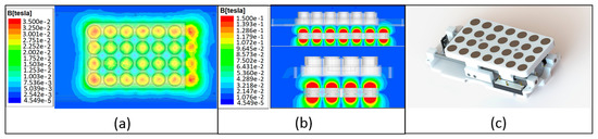 (a) Magnetic field intensity distribution at the bottom of 24-wells cell culture plates, (b) magnetic field force lines simulation in frontal and side planes and (c) rendered model of the mechanical permanent magnets table ball-screw assembly.