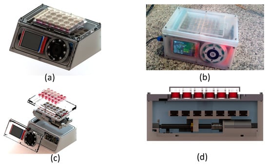 (a) Representation of the bioreactor assembled with a cell culture plate; (b) Bioreactor prototype built mechanism with every component; and schematic representation of (c) all disassembled main electric and mechanical components and (d) of the mechanical component represented as a transversal cut.