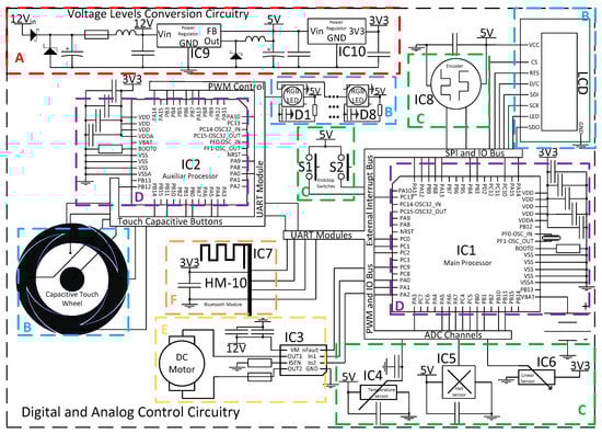 Main circuits used for the power conversion (A), user interface (B), sensors (C), system control (D), actuators (E) and wireless communications (F).
