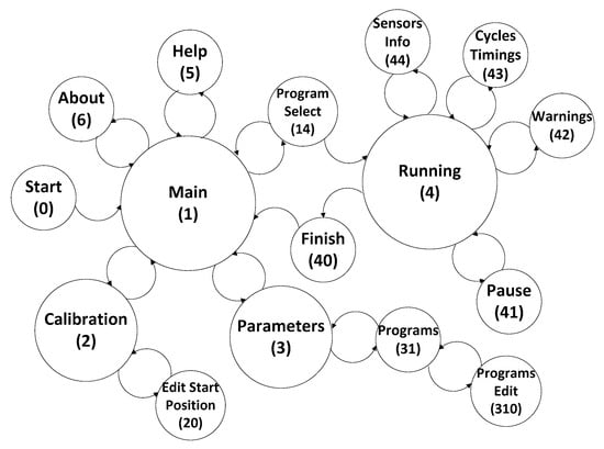 The developed circuit was based on microcontrollers and digital communication with every component on the control boards. Regarding magnetic output, it must be noted that the peak amplitude was topped by the permanent magnets magnetization grade, thus the electromechanical component will control solely how much amplitude will reach the culture plate through the Hall sensor, as well as the displacement and frequency. Thus, the resulting mechanism control followed an approach by calculated displacement steps that will fit a distance at a given displacement frequency in order to output at the culture plate an approximate alternated magnetic field wave. However, motor sliding was a problem, using firmware breaking mechanisms with the aid of the IC3 H-Bridge, together with linear sensor for displacement error, more precise control was enabled over the mechanical response, and consequently the magnetic field. The interface, communication and each machine state (Figure 5) was controlled by firmware developed for each microprocessor according to their own respective tasks. The different machine states allowed the user to interface with each system functionality and take advantage of its calibration, variable settings and running processes.