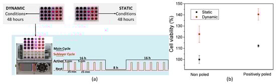 (a) Stimuli schedule timing programmed in the bioreactor for pre-osteoblast tissue culture assays using either static or dynamic conditions and (b) cell viability after 48 h of cell culture on TD/PVDF films with and without magnetic stimuli. The cell viability was calculated regarding the cells growing on the non-poled ME film at static conditions presented as % of growth. In each study, three samples were assayed per studied condition.