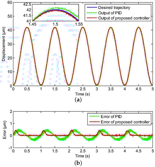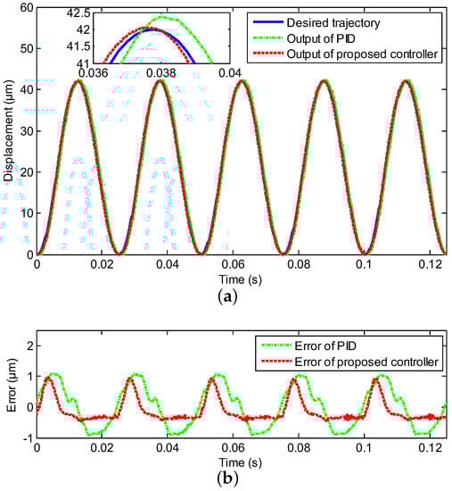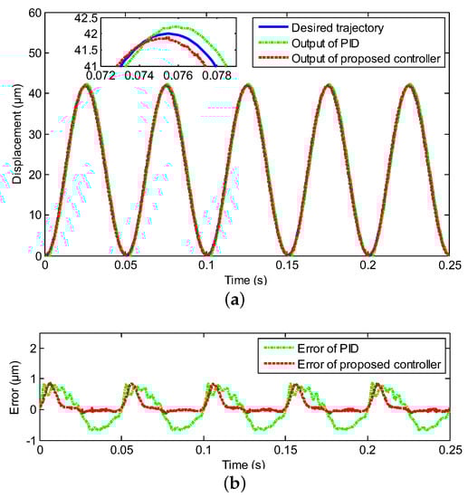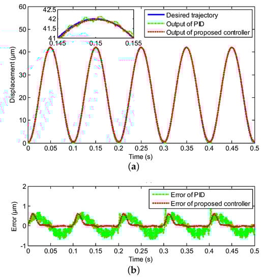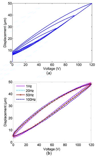 A piezoelectric actuator (PEA) is a transducer that converts electrical energy into a mechanical displacement or stress based on a piezoelectric effect, or vice versa [,]. Compared with traditional electromechanical systems, the PEA actuated nanopositioning system has primary advantages [,,] including the large mass ratio, sub-nanometer resolution, high positioning accuracy, and fast response characteristic; hence, it is extensively applied in atomic force microscope [], ultra-precision mechanical control [], biological manipulation [], and other related fields. Nevertheless, the dominant challenge of the PEA derives from the hysteresis nonlinearity, which impedes the nanopositioning systems from obtaining the fine property notably []. Hysteresis nonlinearity is the non-smooth nonlinear behavior between the input voltage and the output displacement of the PEA [,]. Hysteresis nonlinearity is multivalued and nonlocal memoryless, which brings on the multivalued mapping behavior [,], as shown in Figure 1a. As the amplitude of the input signal increases, the input-output curves of the PEA will generate different hysteresis loops. Furthermore, the maximum value of the displacement changes from 40 m to 120 m, and this phenomenon indicates that the output displacement of the PEA is not only dependent on the current value of the input voltage, but also is related to the historical value. Beyond that, the work in [] declared that the hysteresis nonlinearity is a rate-dependent behavior likewise, as shown in Figure 1b. The shape of the hysteresis loops becomes wider gradually as the frequency of the input voltage is increased from 1 Hz to 100 Hz, which means that the input frequency of the driven signal is the inevitable factor to effect the output displacement. In addition, along with the growing of the input voltage frequency, the tracking errors caused by the hysteresis nonlinearity increase as well. To meet such a challenge, some control schemes have been proposed for the PEA during the past decade. The feedforward control approach is most widely used for compensating the hysteresis nonlinearity, structuring a controller by placing in a feedforward loop as a compensator with various models. These models include the Preisach model [], the Prandtl–Ishlinskii model [,,], the Krasnoselskii–Pokrovskii model [], the Bouc–Wen model [,], the Duhem model [,], the Dahl model [], and the neural network model [,] to suppress the undesirable behaviors. It is pointed out that the precision of open-loop control is affected by modeling errors concerning these hysteresis models; furthermore, open-loop control cannot suppress the influence of external interference.