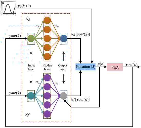 However, it is tough to describe the uncertainties of the PEA and its complex hysteresis nonlinear behavior sufficiently. Therefore, and are commonly unknown. To solve this problem, two neural network identifiers and are adopted to approximate the nonlinear functions and , respectively. Then, the control law in Equation (4) is rewritten as follows:
