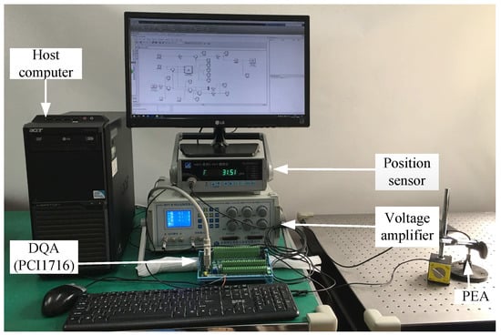 To confirm the efficiency of the proposed neural network self-tuning control method, plenty of experiments were executed on a commercial PEA product, in which the trajectory tracking performances were certified through a PC based control system. The experimental system, shown in Figure 3, was composed of a data acquisition (DAQ) interface (PCI-1710, Advantech, Taiwan, China), a voltage amplifier (HPV-3C, SuZhou Micro Automation Technology Co., Ltd, Suzhou China), a PEA (PZT 150/7×7/50, SuZhou Micro Automation Technology Co., Ltd, Suzhou China), a position sensor (MDSL-0500M6-1A, SuZhou Micro Automation Technology Co., Ltd, Suzhou China), and a host computer. The specifications of the considered PEA product are presented in Table 1. The input voltage for the PEA was sent to actuate the PEA by a digital-to-analog converter and amplified by a voltage amplifier later on. The displacement output of the PEA was detected by a position sensor and sampled by an analog-to-digital converter later on. The experiments were implemented by using the host computer with the MATLAB/Simulink software installed.