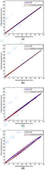 The real displacement outputs of the PEA are marked as the red line, and it can track the desired trajectories noted by the blue line effectively. The errors caused by the model uncertainties and hysteresis nonlinearity could be decreased owing to the proposed neural network self-tuning control approach. Combined with the above advantage, the trajectory tracking errors decreased to a satisfying range. Furthermore, the tracking errors were evaluated by two types of performance indicators, i.e., the root mean squared error (RMSE) and the maximum error (MAXE) were calculated to assess the experimental results. As shown in Table 2, the MAXEs of the proposed controller under the different input frequencies were 1.02%, 1.26%, 1.85%, and 2.45%, respectively, and they were 50%, 55%, 26%, and 25% less than those of the classical PID controller. In addition, the RMSEs were 0.1133 m, 0.2431 m, 0.2545 m, and 0.3148 m with diverse input frequencies of 1 Hz, 10 Hz, 20 Hz, and 40 Hz by the proposed neural network self-tuning control approach, and they were reduced by 49%, 22 %, 47%, and 40%, respectively, compared with the classical PID controller. The input-output relations of the neural network self-tuning control system are shown in Figure 8, which illustrates that the proposed scheme was valid in diverse frequencies. Furthermore, compared with the PID control method, the hysteresis nonlinearity of the PEA could be significantly suppressed by the proposed controller, and the high-precision tracking goal was achieved via our developed control approach. In addition, in spite of the tracking errors arising by the rate-dependent hysteresis nonlinearity being increased with the growth of frequency, the tracking errors were still within the allowable range. Moreover, according to Table 1, the nominal displacement of the PEA was (50 ± 10%) m, and the maximum displacement in the experimental results was 42 m. This implied that our experimental range covered (84.84 ± 8.48)% of the nominal displacement, which demonstrated the rationality of our experiments for eliminating the hysteresis within this range. Therefore, it was obvious that excellent tracking accuracies of the proposed controller could be obtained, which demonstrated the effectiveness of the developed control method.