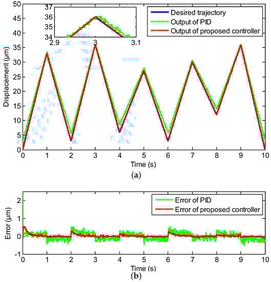 Compared tracking performance of the PEA under the mixed triangular reference, including (a) the controller output tracking curve and (b) control error.