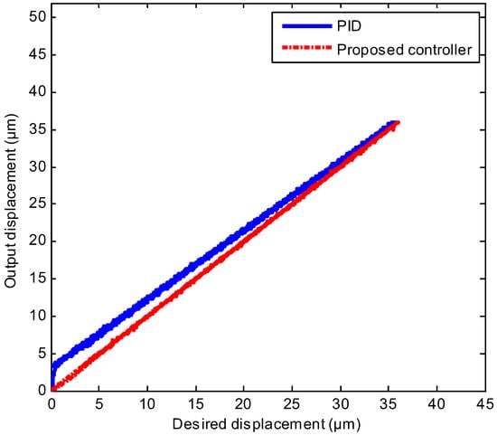 To further verify the excellent performance of the proposed method, a more complex trajectory tracking experiment was executed, where the desired trajectory was the mixed triangular wave with different amplitudes. The mixed triangular trajectory tracking result is depicted in Figure 9, where the real displacement outputs of the proposed controller marked with the red line could track the desired trajectory marked with the blue line well. Figure 10 represents the input-output relation of the neural network self-tuning controller and the PID controller. As shown in Figure 10, compared with the PID controller, the output displacement and the desired displacement could almost maintain a linear relationship, which manifested the validity of the proposed scheme when tracking the mixed triangular reference. The MAXE and RMSE of constructed controller were 1.56% and 0.1245 m, and compared with the PID controller, they were improved by 54% and 47%, respectively, which demonstrated that the neural network self-tuning control scheme was effective for the complex trajectory tracking requirement.