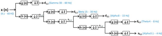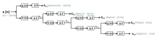 Discrete wavelet transformation (DWT) [] is calculated by additional high-pass and successive low-pass filters and sub-sampling using the Mallat algorithm []. Additional filtering applied to a real EEG signal leads to double the number of data from the original one being requested after each filtration to reduce the number of samples by sub-sampling of the EEG signal. DWT uses the dyadic variant. In the wavelet analysis, approximations (a (n)) and details (d (n)) are used (Figure 1 and Figure 2):