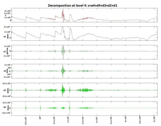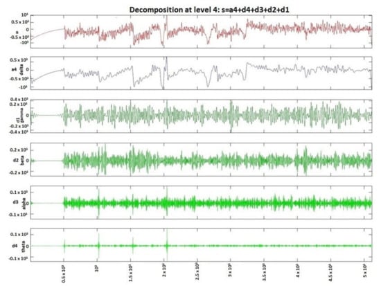 The wavelet transform is a way to implement a particular type of signal representation called multi-resolution analysis [,]. The analyzed signal is described by a succession of details and approximations that contain more information. Each level of approximation (Figure 1 and Figure 2) contains information available at the previous level, which is an added component of detail. In Figure 3, the signal processed by discrete wavelet transform and Daubechies method using four decomposition levels for a patient before and after a short seizure is presented. In Figure 3, detail d1 represents gamma waves, detail d2 represents beta waves, detail d3 represents alpha waves, detail d4 represents theta waves, and the approximation a4 represents delta waves.