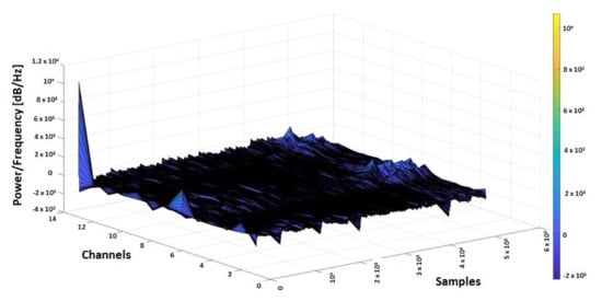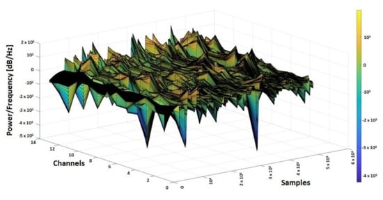 The purpose of using PPG and EMG signals in correlation with EEG was to find a modification of the biomedical signals collected from wearable devices that could anticipate an epilepsy seizure and to use a software system to send medical alerts in advance [,,,,,,]. From the CAP Sleep Database, the biomedical signals taken from 2 patients (n1 and n2) were used for the actual study. In Figure 6 and Figure 7, the 3D spectrograms for the EEG signals (Fp2-F4, F4-C4, C4-P4, P4-O2, F8-T4, T4-T6, FP1-F3, F3-C3, C3 -P3, P3-O1, F7-T3, T3-T5, C4-A1) taken from patients n1 and n2 are presented. In the case of patient n1, the epileptic spikes for gamma waves cannot be observed (Figure 6), but in the case of patient n2, these spikes are evident, marked with yellow-orange in the 3D spectrogram (Figure 7) and being above the 120 Hz threshold.