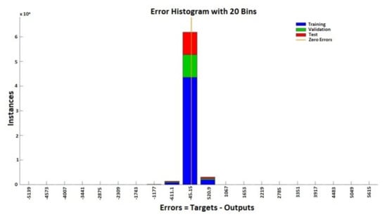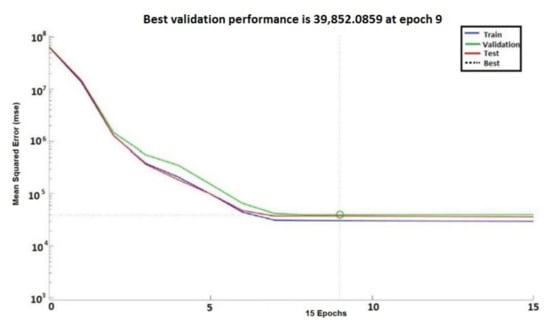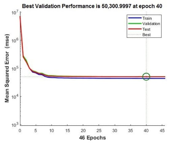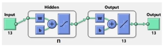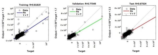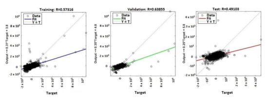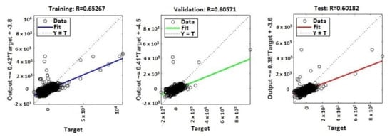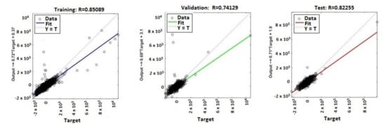 MATLAB libraries were used to perform the functions and the code sequences within the neural networks. The regression plots (9–12) show a regression between network outputs and network targets. The parameterized linear regression model is given by mathematical relation (3). The R (Equation (3)) value indicates the relationship between the outputs (y) and targets. If R = 1, this indicates that there is an exact linear relationship between outputs and targets. If the R-value is close to zero, then there is no linear relationship between the outputs and targets.