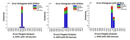The continuous training of neural networks is based on extensive datasets; 70% (3584 samples) of the total data generated by the ANNs were used to train the model, while 15% (768 samples) of the data was used for testing and 15% (768 samples) for validation (Figure 9, Figure 10, Figure 11 and Figure 12). Regression analysis of the ANN model showed the R2 (regression) values for training between 0.57316 for the ANN with ten neurons, 0.65267 for the ANN with 50 neurons, 0.85089 for the ANN with 100 neurons, and 0.81819 for the ANN with 150 neurons, showing the higher accuracy and significance of the ANN model for the ANN with 100 neurons, respective to the ANN with 150 neurons.