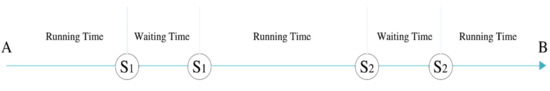 In this paper, we predict the total travel time of a bus journey by using the actual running time and waiting time from open data. For any stops in the trip, a bus is scheduled to arrive and depart from a stop S at different specified times, defined in the timetable, respectively, and . In general, travel time forecasting is an estimate of the trip from a station of origin to a station of destination. The running time is the absolute difference between the arrival time of the current station and the departure time of the previous station, such as . The waiting time is the absolute difference between the departure time and the arrival time in a fixed stop station, such as, Our study defines segments based on information about the stops of a trip pattern. The segment-based method divides the stop points into running time and waiting time segments. Our predictive models predict the running and waiting times based on different and . According to Figure 1, it is evident that the numbers of input data for the prediction of running time and waiting time are different. This is because for each trip of a specific bus, the running time will have one more record than the waiting time. The total travel time of a bus journey can be described with Equation (1):
